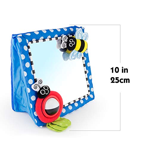 Encourage baby to focus on a human face with the large true-reflection mirror. The attached symmetrical butterfly inspires vision and encourages tactile exploration. The high contrast ladybug and tracker ball aids in the development of baby’s visual perception while the textured leaves offer peek-a-boo play. The soft frame of the mirror is perfect for baby’s environment, and the easel back allows the mirror to stand on flat surfaces.