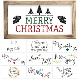 Rustic Wall Decor Set W/ 10 Design Options: Kibaga brings on the inspirational & seasonal vibes with 10 lovely design options that give you the opportunity to switch sayings whenever you like to! Set incl. one rustic wooden frame (w/o glass), 5 reversible prints with 4 joyful artworks for spring, summer, fall, Christmas, Easter, Valentines day, St. Patricks day, 4th July & 2 letterings